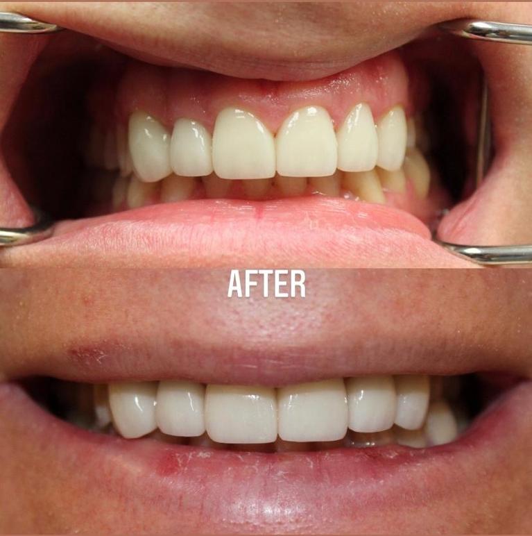 Before: Discoloration of front teeth. After: Placement of implant crown and porcelain crown on the two front teeth with four veneers adjacent to them.
