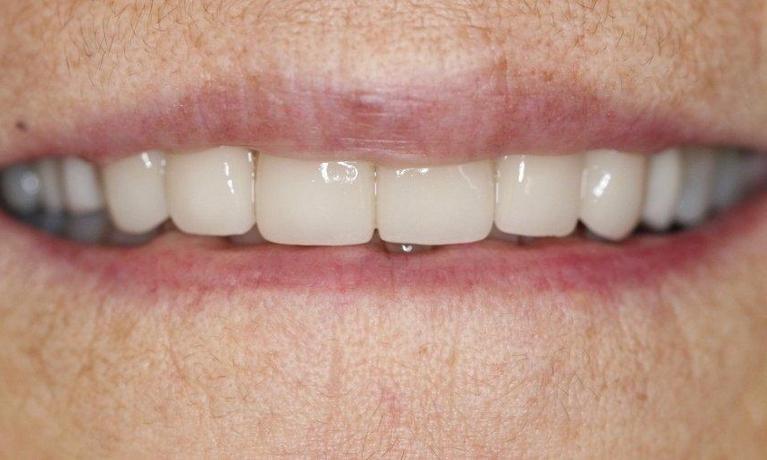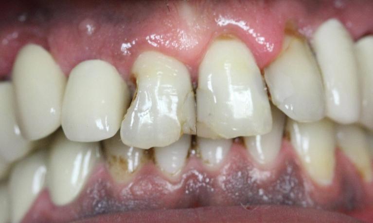 The patient had lost top front teeth due to periodontal disease. After Implant placement, missing teeth were restored beautifully with an implant bridge.