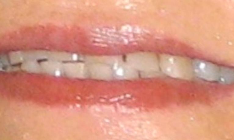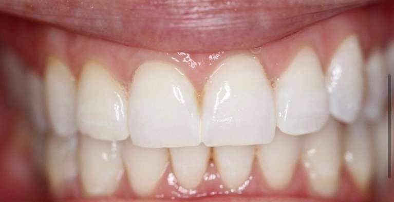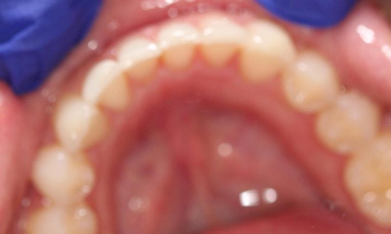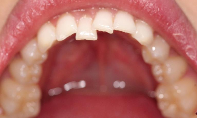 Spacing-- Spaces between the teeth. Back teeth are together but space is present between the front teeth. After frenectomy procedure with laser dentistry and 6 months of Invisalign treatment, teeth have aligned properly for a healthier mouth.