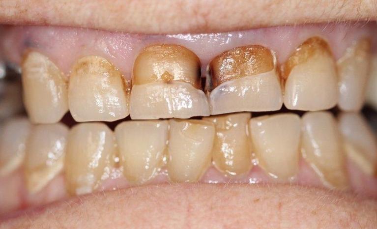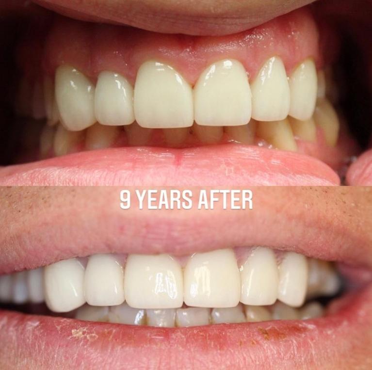 Damaged caries upper front teeth were restored with porcelain Crowns and Veneers. Missing posterior teeth were restored with Implant