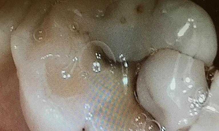 This patient's broken amalgam filling started developing secondary decays underneath it. After we removed the decay and old filling, the tooth was properly restored with a porcelain onlay.
