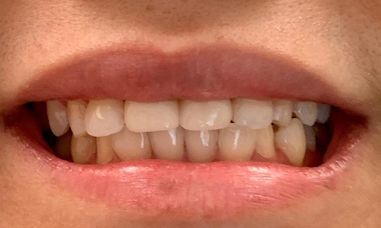 Crowding and open bite-- Some potential issues: Buildup of plaque and tartar, harbors harmful periodontal bacteria, risk of periodontal disease, tooth, and bone loss. After 5 months of Invisalign treatment, teeth have aligned properly for a healthier mouth.