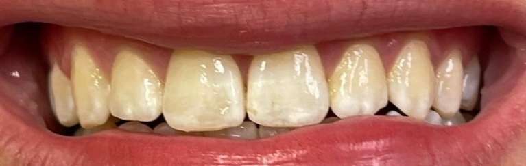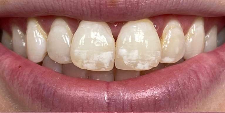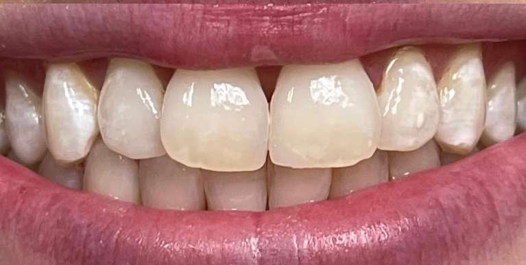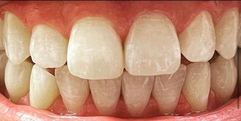 White spots on front teeth due to decalcifications after braces removal and After: Laser teeth whitening + Icon Resin Infiltration treatment