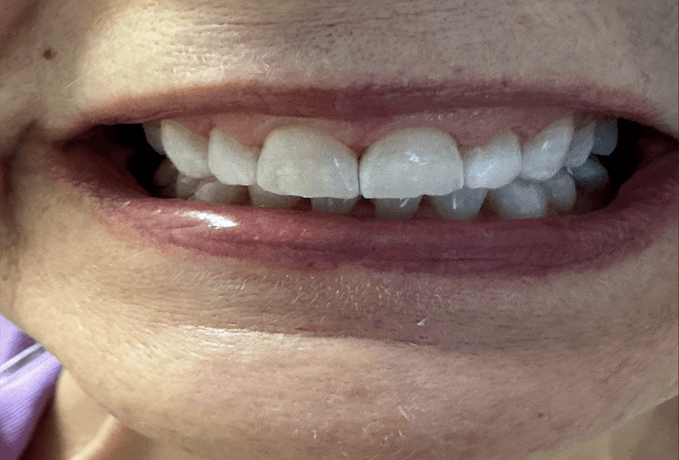 Final result after KOR Whitening and implant bridge for lower missing teeth.