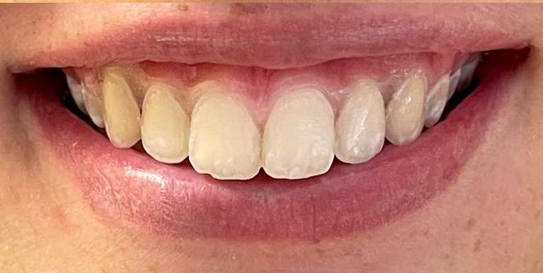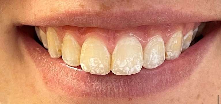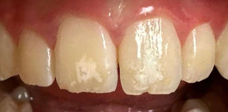 White spots on front teeth due to decalcifications after braces removal and After: Laser teeth whitening + Icon Resin Infiltration treatment