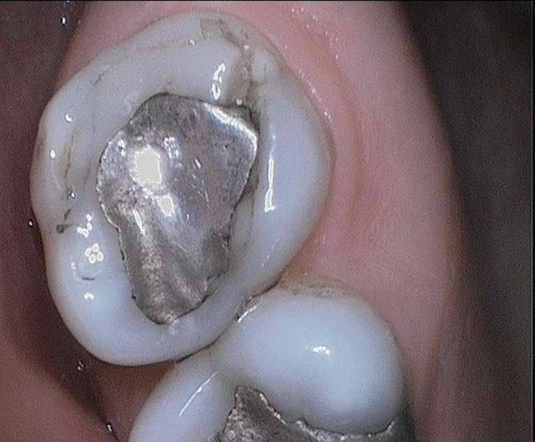 This patient's broken amalgam filling started developing secondary decays underneath it. After we removed the decay and old filling, the tooth was properly restored with a porcelain onlay.